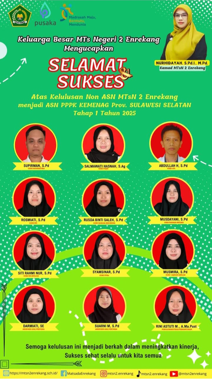 Nurhidayah selaku Kepala MTs. N 2 Enrekang menyampaikan rasa syukur atas pencapaian tersebut. “Kami sangat bersyukur dan bangga atas prestasi ini. Selamat kepada para pendidik dan tenaga kependidikan yang lulus seleksi PPPK. Semoga amanah dalam menjalankan tugas sebagai abdi negara dan terus memberikan kontribusi terbaik untuk pendidikan di madrasah ini,” ujarnya.